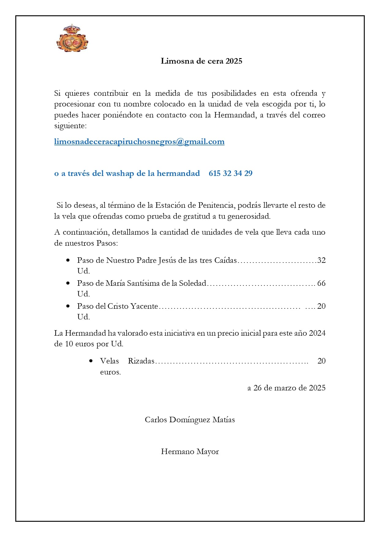 a través de nuestro  WhatsApp de la hermandad en el teléfono 615 32 34 29.