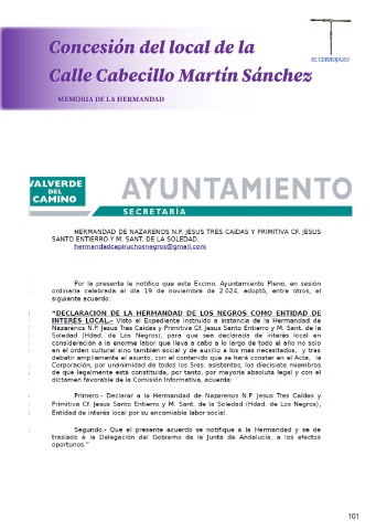 Concesión del local de la EL CERROJAZO Calle Cabecillo Martín Sánchez MEMORIA DE LA HERMANDAD 101